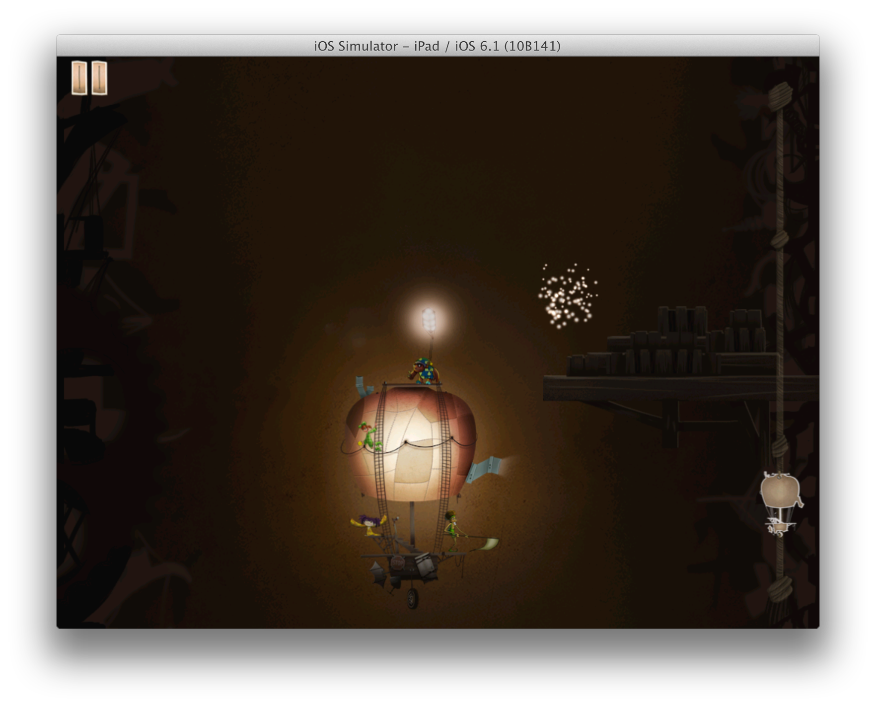 We built Clockturne, a multiplayer iOS game for two or three players using locally networked devices. One player, on an iPad, guides the ascent of a hot air balloon through a nightmarish tower. They must dodge obstacles, stun enemies, and guide the other players towards the fireflies needed to power the balloon. Those players, on iPhones or iPod Touches, use the gyroscope in their device to steer their character and collect fireflies.