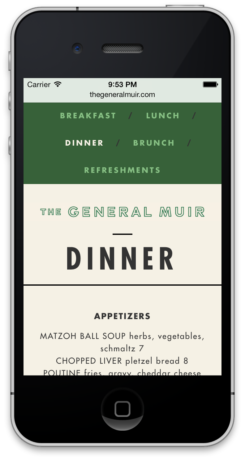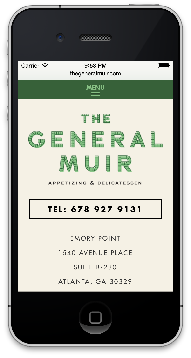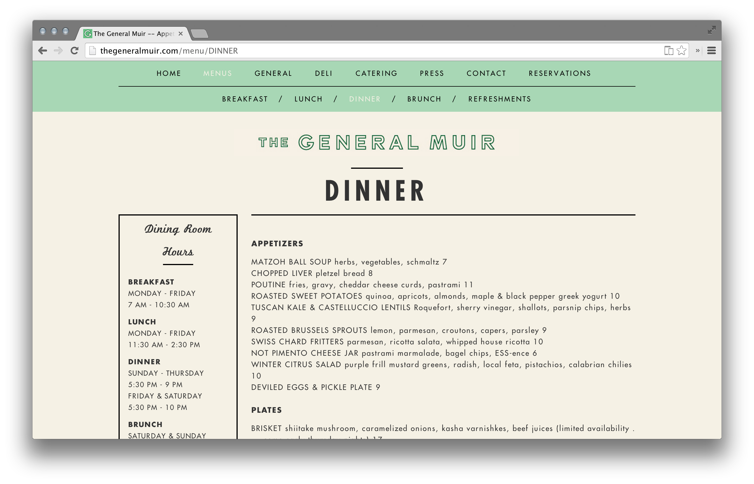 The General Muir opened up at Emory Point in Atlanta in late 2012. Daniel was commisioned to build a dynamic and responsive site to showcase their menu and their unique approach to the NYC Jewish deli in Atlanta. In addition to a responsive front end we also built an integrated content management system that enables real-time content changes using the power of Meteor.